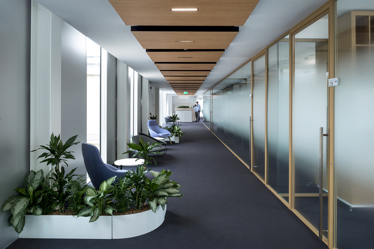Feste Glastrennwände mit schlanken Metallprofilen und hochwertigen Glaselementen sorgen für optimale Lichtverhältnisse und eine ruhige, professionelle Atmosphäre. Sie fungieren als transparentes Gliederungselement, das Konzentration ermöglicht, ohne ein Gefühl von Enge oder Abgeschlossenheit zu erzeugen. Form und Funktion gehen dabei eine harmonische Verbindung ein – moderne Arbeitswelten profitieren von dieser klaren, reduzierten Gestaltung.
